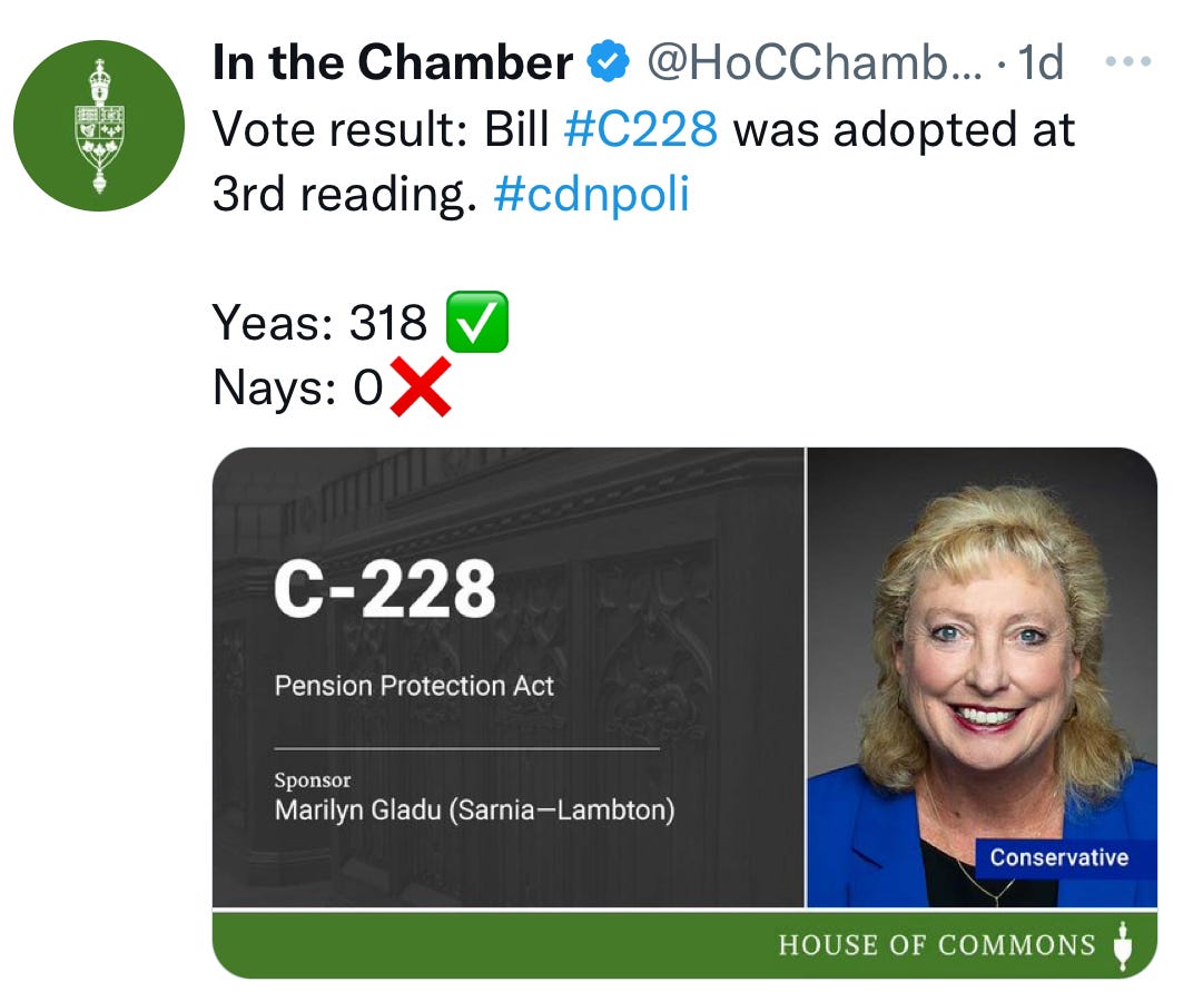 Bill C-228 received unanimous approval, and will now go to the Senate for further study. C-228 protects the pension of workers whose businesses go into bankruptcy. The legislation proposes to prioritize pensioners and their benefits ahead of creditors in case of company bankruptcies which will help protect pensioners.