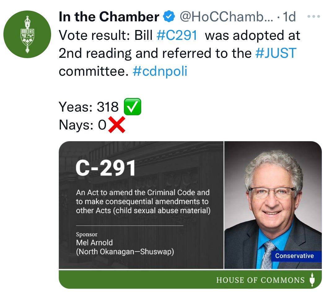 C-291 received unanimous approval and will go to committee for more study. This bill amends the Criminal Code by changing the language around sexual material involving children. Changing ‘child pornography’ to ‘child sexual abuse material’ ensures that all materials involving a minor being exploited in a sexual nature will be covered by the Criminal Code, giving no loophole for those who create and solicit such material.
