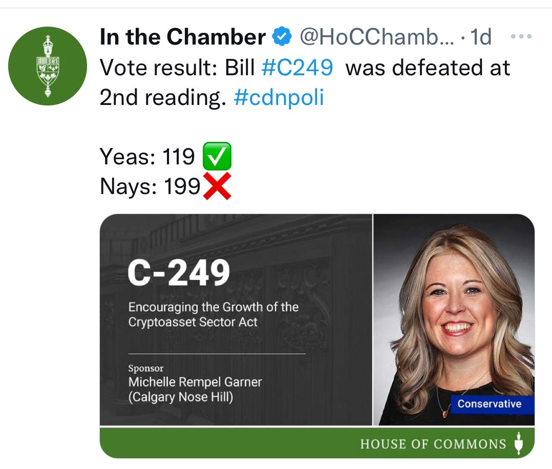 C-249 was voted down by the NDP, Liberals and Bloc. C-249 would have the Minister of Finance create a national framework to encourage growth in the cryptocurrency sector. Recent price variations and large drops in valuation in different cryptocurrencies has been the leading headline in 2022 for this type of currency. Investors would have been better protected with this framework legislation.