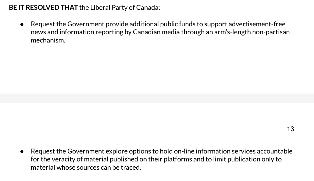 Calling for online platforms and news channels online like CTV, Global or PBS to be held accountable for their journalism, and to be obliged to submit to having their sources traced, is autocratic overreach. It's a further sign that the party is drifting away from its historic roots in liberalism and towards more authoritarian measures seen in repressive regimes around the world. While the Liberals may claim its non-binding, its revealing that so many of their rank-and-file supporters are supportive of censoring the news media, as well as allowing the government to dictate who is truthful and whose opinions are sourced to the level politicians or bureaucrats believe correct. It was over a decade ago that a Liberal party convention called for legalization of marijuana, and then hard drugs like cocaine. Both of these are now reality. We should be wary of the federal Liberal government claiming it is not binding. They morph these past resolutions into government policy eventually.